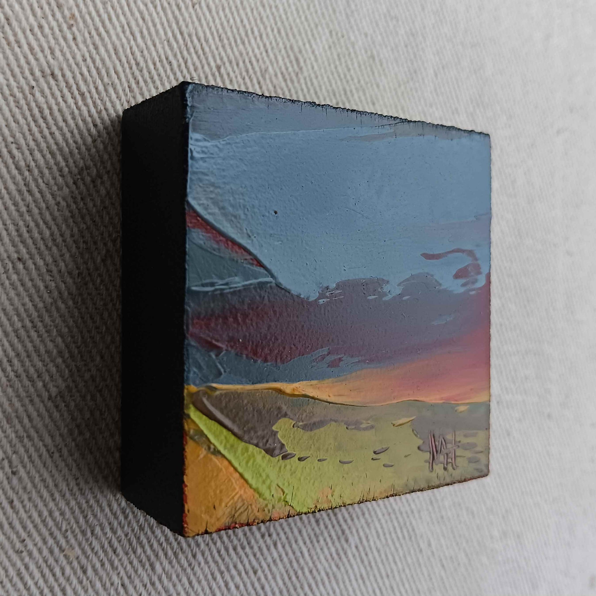 DESCRIPTION: Painted on an 18mm thick block, this artwork is designed to be displayed freestanding on a flat surface such as a shelf or a mantlepiece. It can also be framed if desired alone or as a multi panel display.
